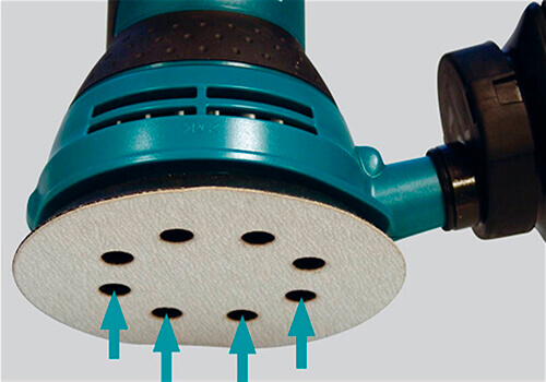 Dust is extracted through 8 holes under the pad and collected in a dust bag